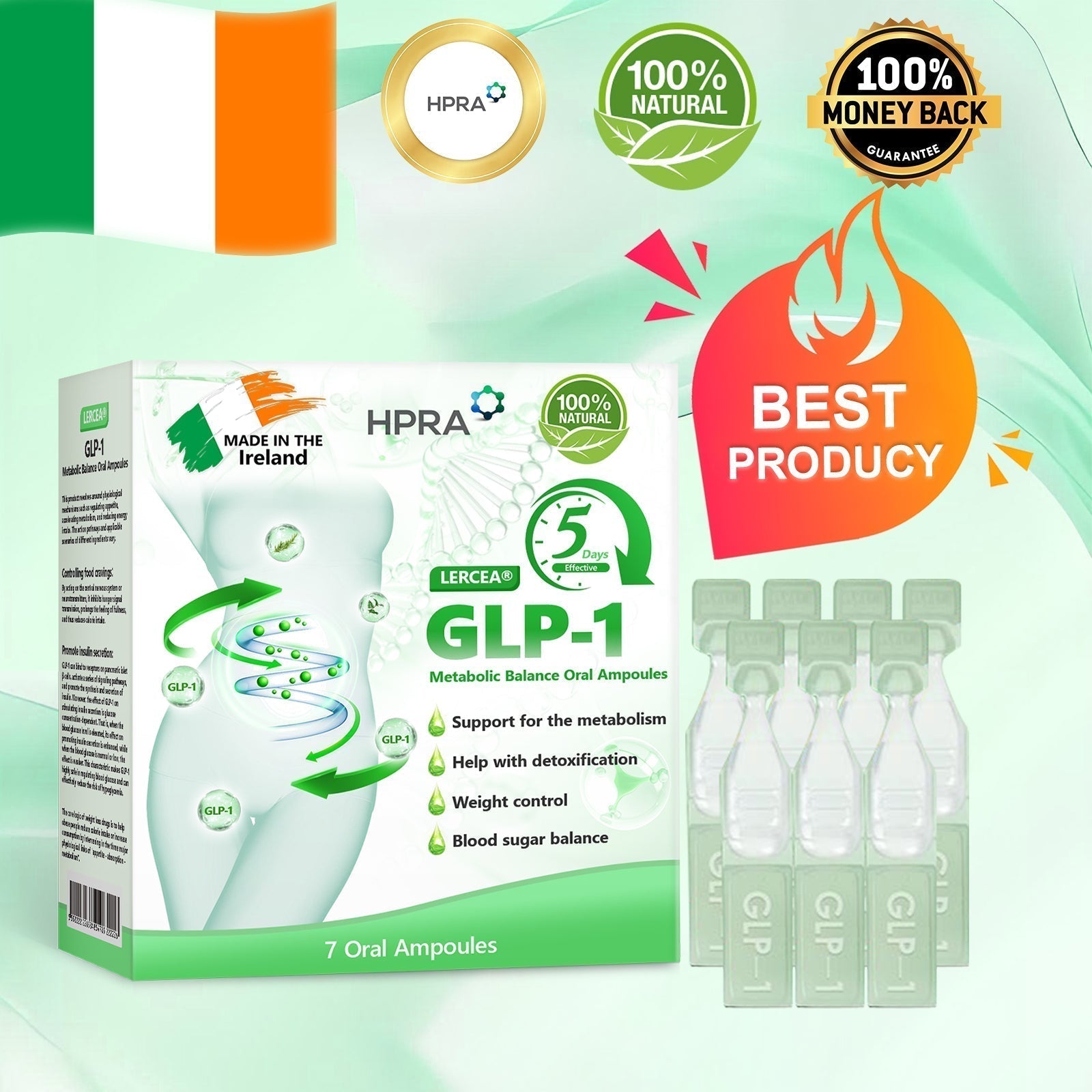 • โœ…ย Safe & Effective: Made with natural ingredients and a science-backed formula. Our oral liquid is manufactured in a GMP-certified facility and developed to meet strict Ireland and EU safety standards. It supports metabolism, blood sugar balance, appetite control, and healthy fat loss โ€” promoting overall vitality.